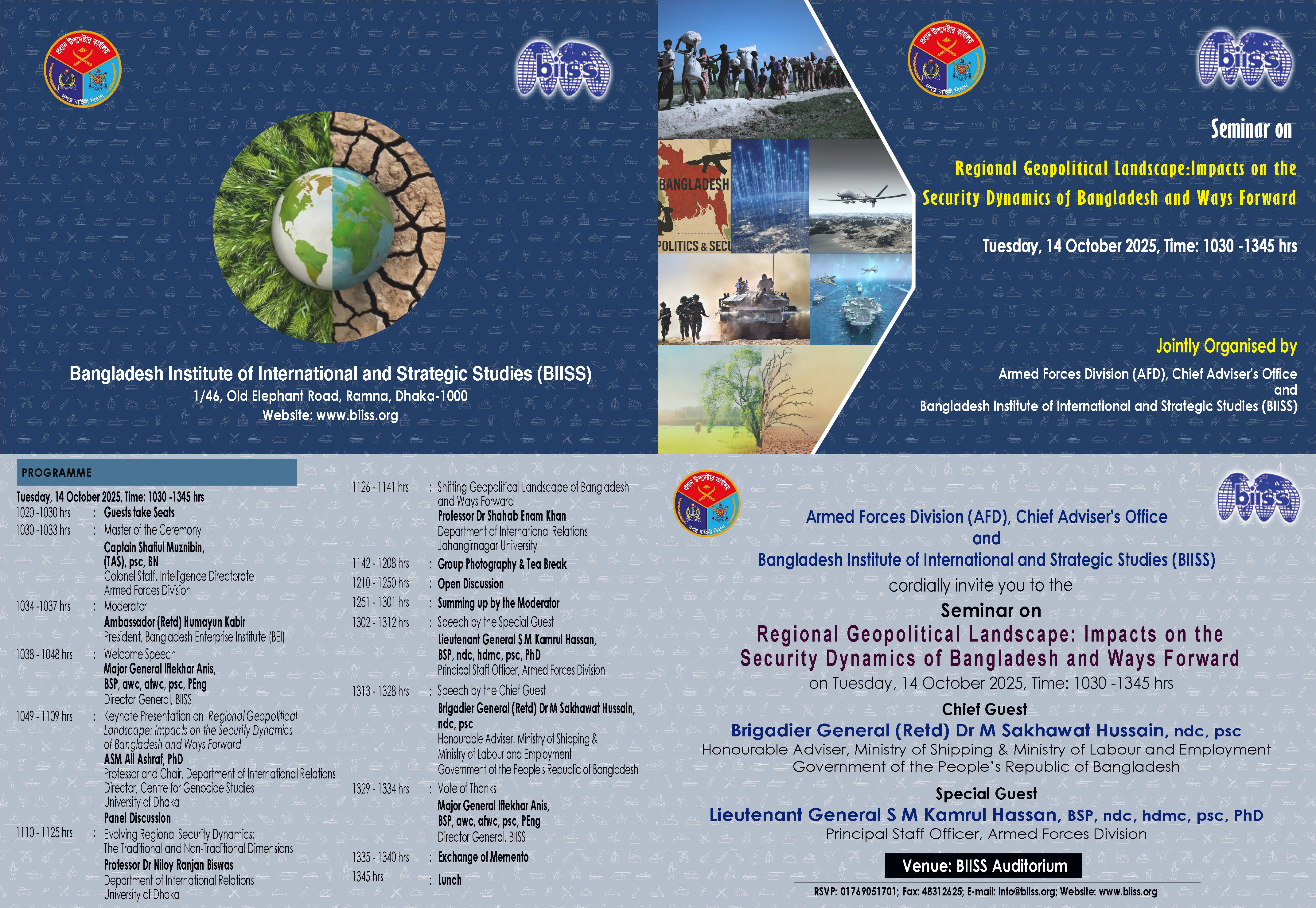 Armed Forces Division (AFD), Chief Adviser's Office and Bangladesh Institute of International and Strategic Studies (BIISS) cordially invite you to the Seminar on Regional Geopolitical Landscape: Impacts on the Security Dynamics of Bangladesh and Ways Forward. Chief Guest Brigadier General (Retd) Dr M Sakhawat Hussain, ndc, psc, Honourable Adviser, Ministry of Shipping & Ministry of Labour and Employment, Government of the People’s Republic of Bangladesh. Special Guest Lieutenant General S M Kamrul Hassan, BSP, ndc, hdmc, psc, PhD, Principal Staff Officer, Armed Forces Division on Tuesday, 14 October 2025 at BIISS Auditorium.
