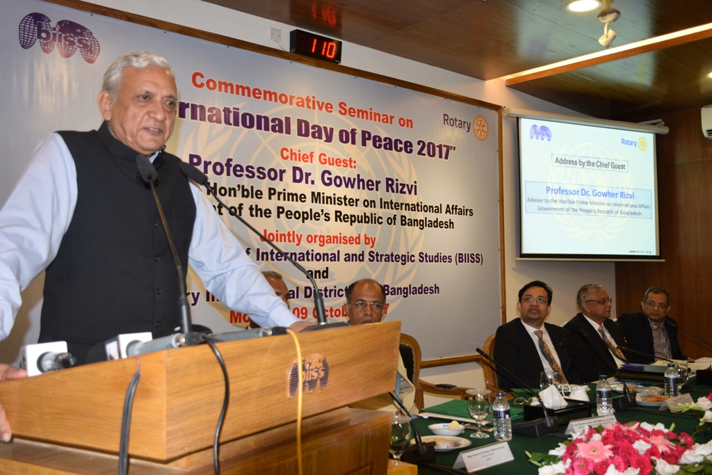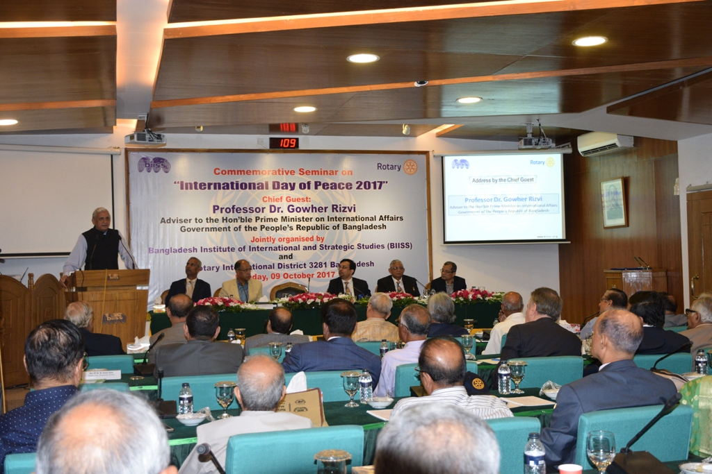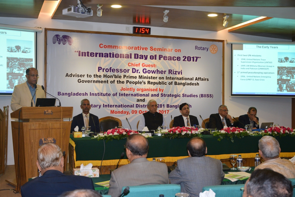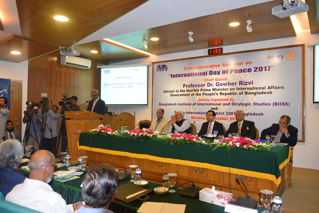 Bangladesh Institute of International and Strategic Studies (BIISS) in collaboration with the Rotary International District 3281 Bangladesh, organized a commemorative seminar on “International Day of Peace 2019” on 26 November 2019. At the same event, the book titled “Bangladesh in International Peacebuilding: Discourses from Japan and Beyond” was also launched. H.E. Naoki Ito, Ambassador of Japan to Bangladesh graced the occasion as the Special Guest. The seminar was chaired by Air Cdre (Retd.) Ishfaq Ilahi Choudhury, ndc, psc, former president, Rotary Club of Ramna and the book launching was conducted by the Editor, Major General A K M Abdur Rahman, OSP, ndc, psc, Director General, BIISS.
