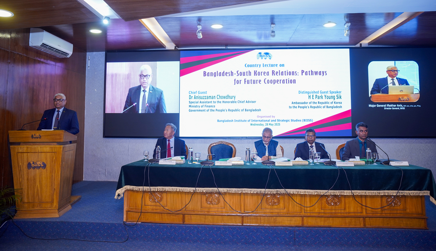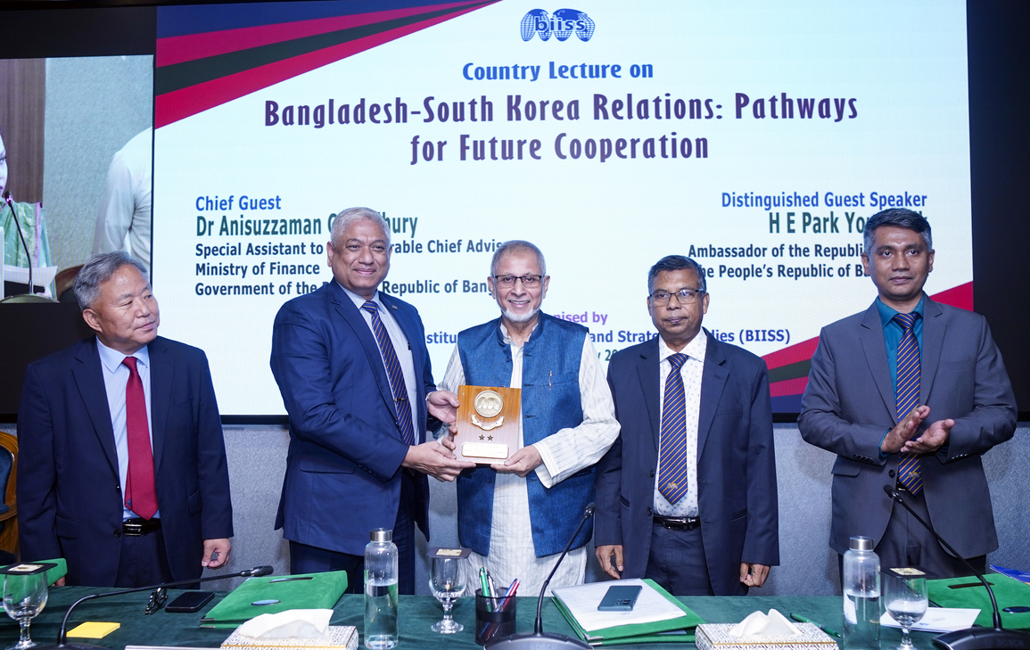Bangladesh Institute of International and Strategic Studies (BIISS) organised a Country Lecture series (CLS) event titled “Bangladesh-South Korea Relations: Pathways for Future Cooperation”, on 28 May 2025. Dr Anisuzzaman Chowdhury, Special Assistant to the Honorable Chief Adviser, Ministry of Finance, Government of the People’s Republic of Bangladesh, graced the programme as the Chief Guest. The event was graced by H E Park Young Sik, Ambassador of the Republic of Korea to the People’s Republic of Bangladesh, as the Distinguished Guest Speaker. Ambassador AFM Gosal Azam Sarker, Chairman of BIISS, chaired the event, and Major General Iftekhar Anis, BSP, awc, afwc, psc, PEng, Director General of BIISS, delivered the Welcome Remarks.
