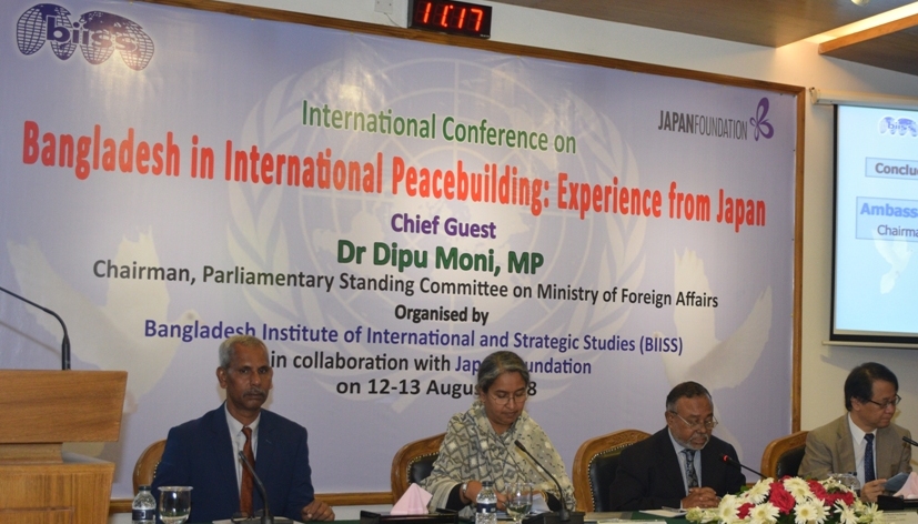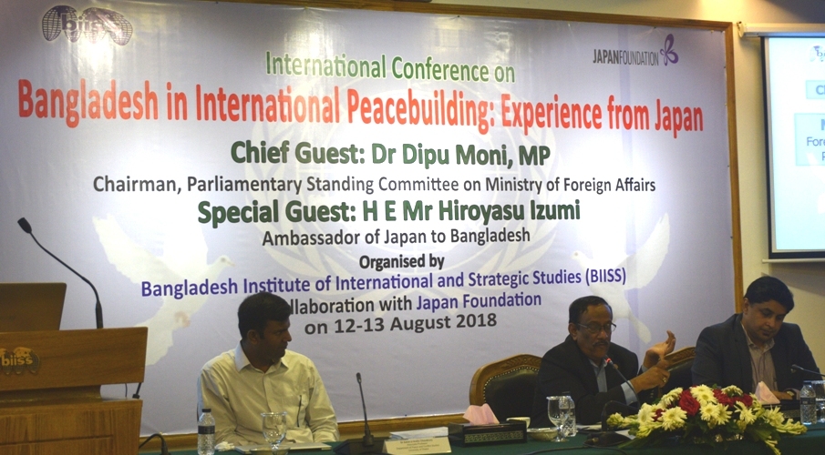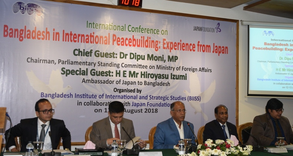 Bangladesh Institute of International and Strategic Studies (BIISS) in collaboration with the Japan Foundation organised a two-day International Conference on Bangladesh in International Peacebuilding: Experience from Japan on 12-13 August 2018 at BIISS auditorium. The Conference was divided into six sessions. Dr Dipu Moni, MP, Chairman, Parliamentary Standing Committee on Ministry of Foreign Affairs, has graced the occasion as the Chief Guest while, H E Mr Hiroyasu Izumi, Ambassador of Japan to Bangladesh was the Special Guest at the inaugural session of the Conference. Major General A K M Abdur Rahman, ndc, psc, Director General, BIISS, delivered the Welcome Address. Ambassador Munshi Faiz Ahmad, Chairman, Board of Governors, BIISS, chaired the inaugural session. Other session Chairs are Mr Md Shahidul Haque, Foreign Secretary, Government of the People’s Republic of Bangladesh, Ms Mia Seppo, UN Resident Coordinator, Mr Truls Julian Jaeger-Synnevaag, Deputy Head of Mission, The Royal Norwegian Embassy, Lt Gen (Retd) Md Mainul Islam Former Chief of General Staff, Bangladesh Army and Ambassador Muhammad Zamir, Commissioner, OIC Independent Permanent Human Rights Commission and Former Chief Information Commissioner of Bangladesh.