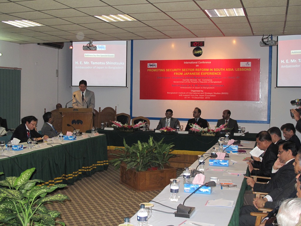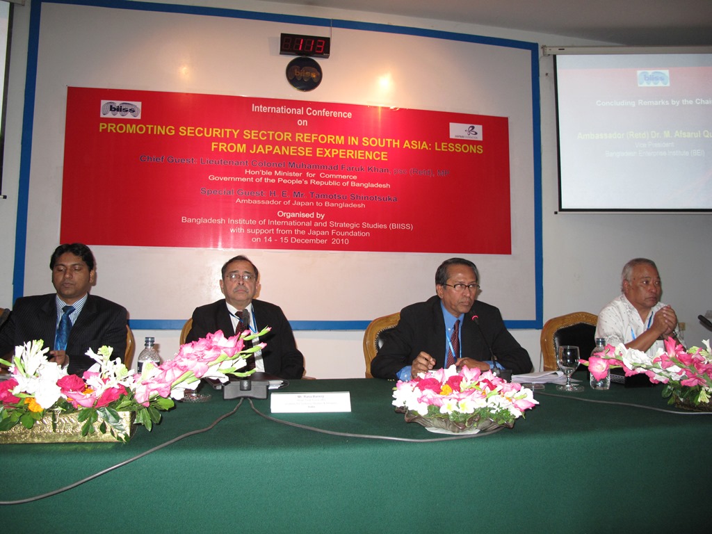 A two-day International Conference on Promoting Security Sector Reform in South Asia: Lessons from Japanese Experience was held at BIISS Auditorium from 14 December 2010 to 15 December 2010. The Conference was organised by BIISS with the support of the Japan Foundation. Colonel A K M Nazrul Islam, afwc, psc, G, Acting Director General, BIISS delivered the welcome address. Lieutenant Colonel Muhammad Faruk Khan, psc (Retd), MP, Hon'ble Minister for Commerce Government of the Peoples Republic of Bangladesh was the Chief Guest at the Inaugural Session of the Conference. H. E. Mr. Tamotsu Shinotsuka, Ambassador of Japan to Bangladesh was present as Special Guest at the Inaugural Session. Major General Muhammed Firdaus Mian, psc, Chairman, Board of Governors, BIISS, chaired the session.