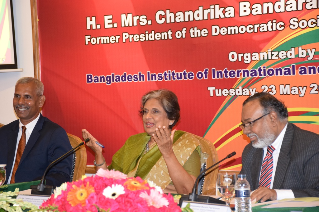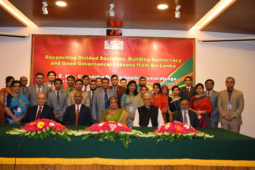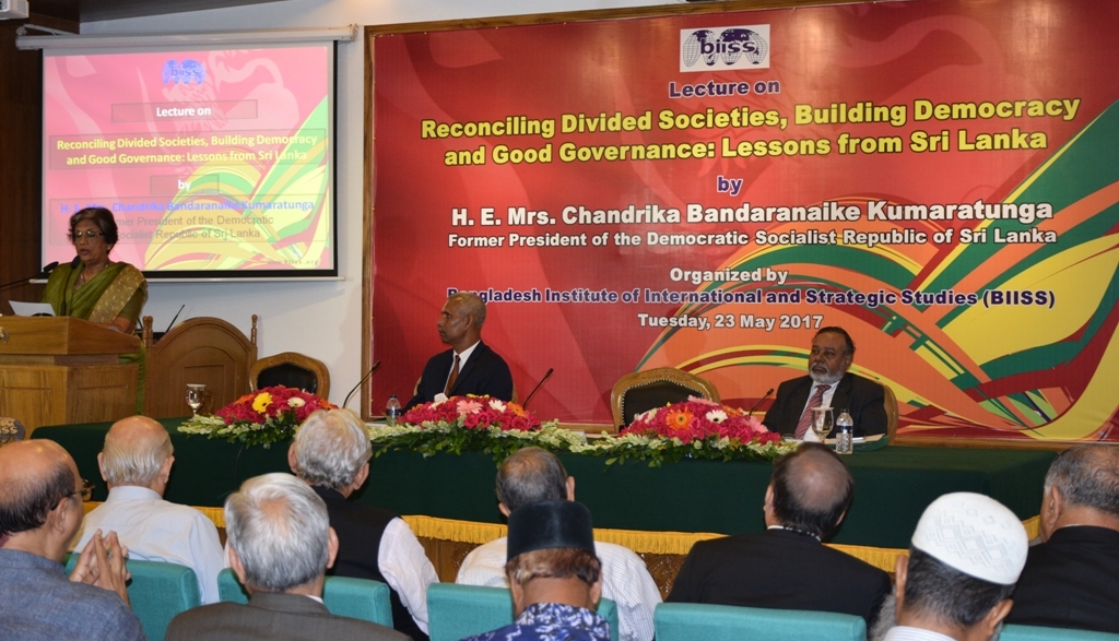 Bangladesh Institute of International and Strategic Studies (BIISS) organised a lecture titled “Reconciling Divided Societies, Building Democracy and Good Governance: Lessons from Sri Lanka” at its auditorium in Dhaka on 23 May 2017, where H. E. Mrs. Chandrika Bandaranaike Kumaratunga, former president of the Democratic Socialist Republic of Sri Lanka and member of Global Leadership Foundation was the Guest Speaker. Major General A K M Abdur Rahman, ndc, psc, Director General, BIISS delivered the address of welcome while Ambassador Munshi Faiz Ahmad, Chairman, Board of Governors, BIISS, chaired the session and delivered the closing remarks.