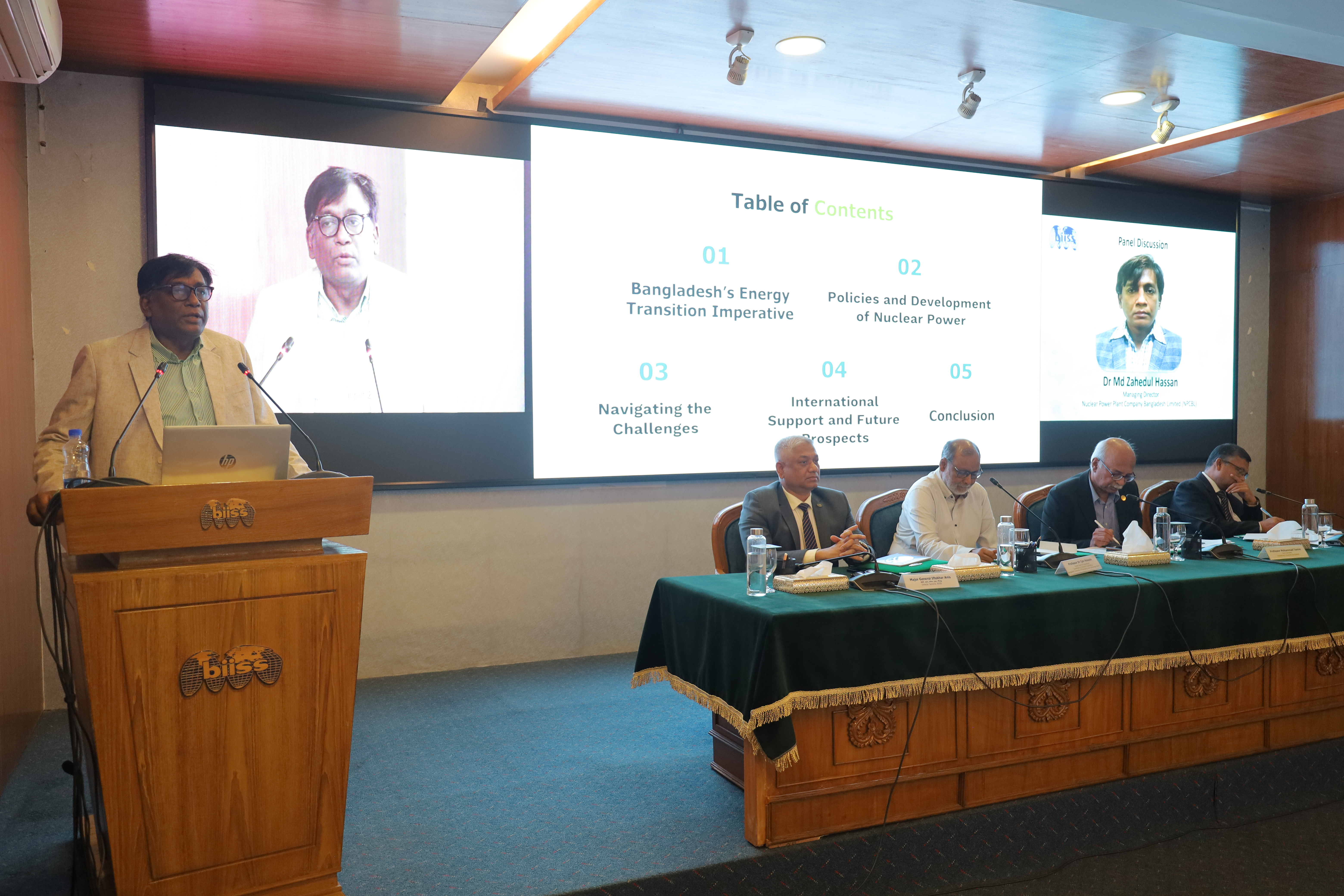 To set the tone of the discussion, Ms Lam-ya Mostaque, Research Fellow, BIISS delivered a comprehensive presentation, titled “Nuclear Energy in Bangladesh: Prospects and Challenges”. Afterwards, a Panel discussion took place where Dr Md Shafiqul Islam, Professor, Department of Nuclear Engineering, Dhaka University; Mr Mahmud Hossain, Director and Chief Engineer, Nuclear Power and Energy Division (NPED), Bangladesh Atomic Energy Commission; Brigadier General Akhtar Shahid, SUP (BAR), ndc, psc, G+, MPhill and Dr Md Zahedul Hassan, Managing Director, Nuclear Power Plant Company Bangladesh Limited (NPCBL) shared their valuable insights and suggestions. Thereafter, an open discussion ensued on the subject matter. Followed by the open discussion, Professor Dr Ijaj Hossein summed up the discussion. Thereafter, the Guest of Honour of the event delivered his insightful remarks on the topic. Finally, the Chair of the program delivered his concluding remarks.