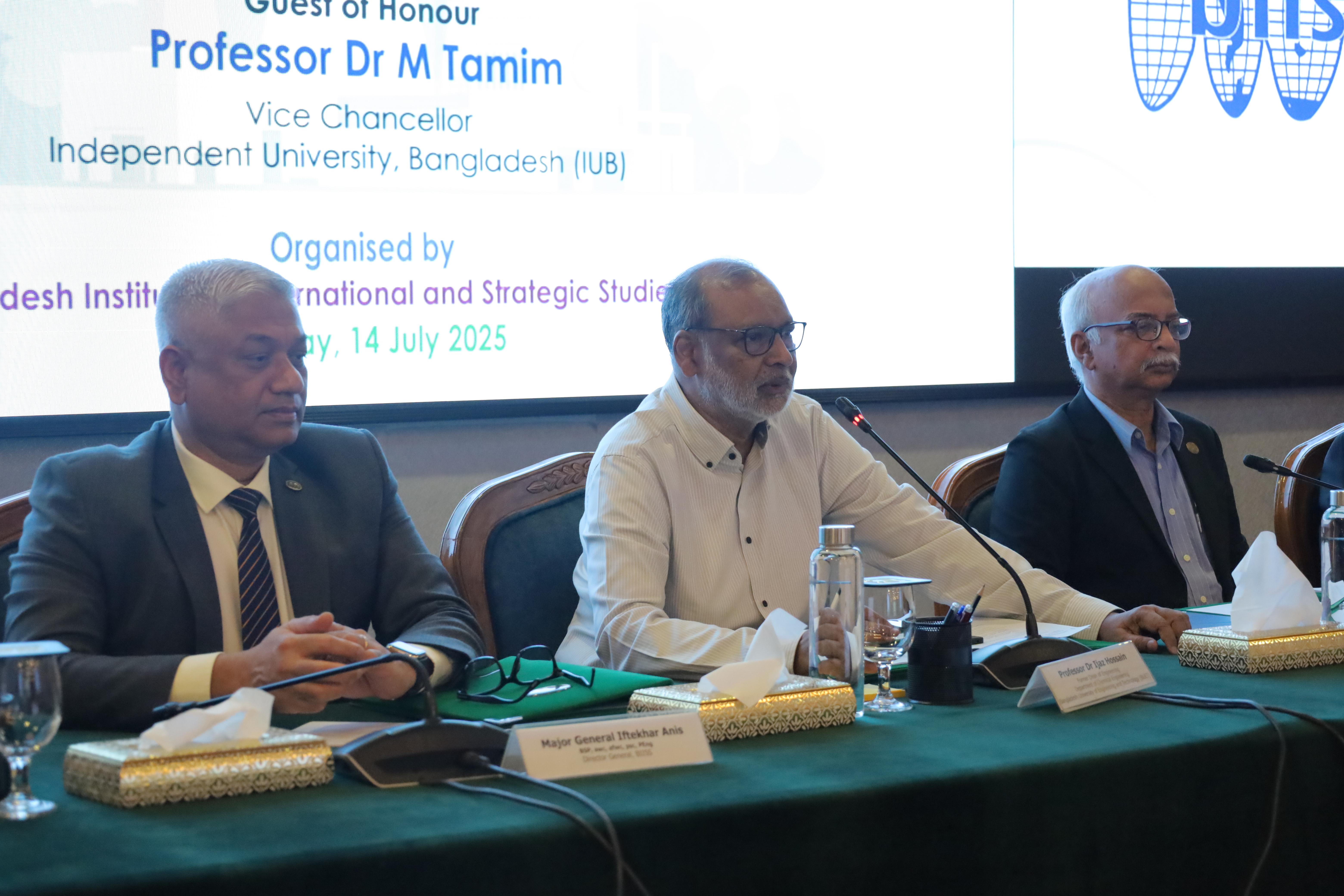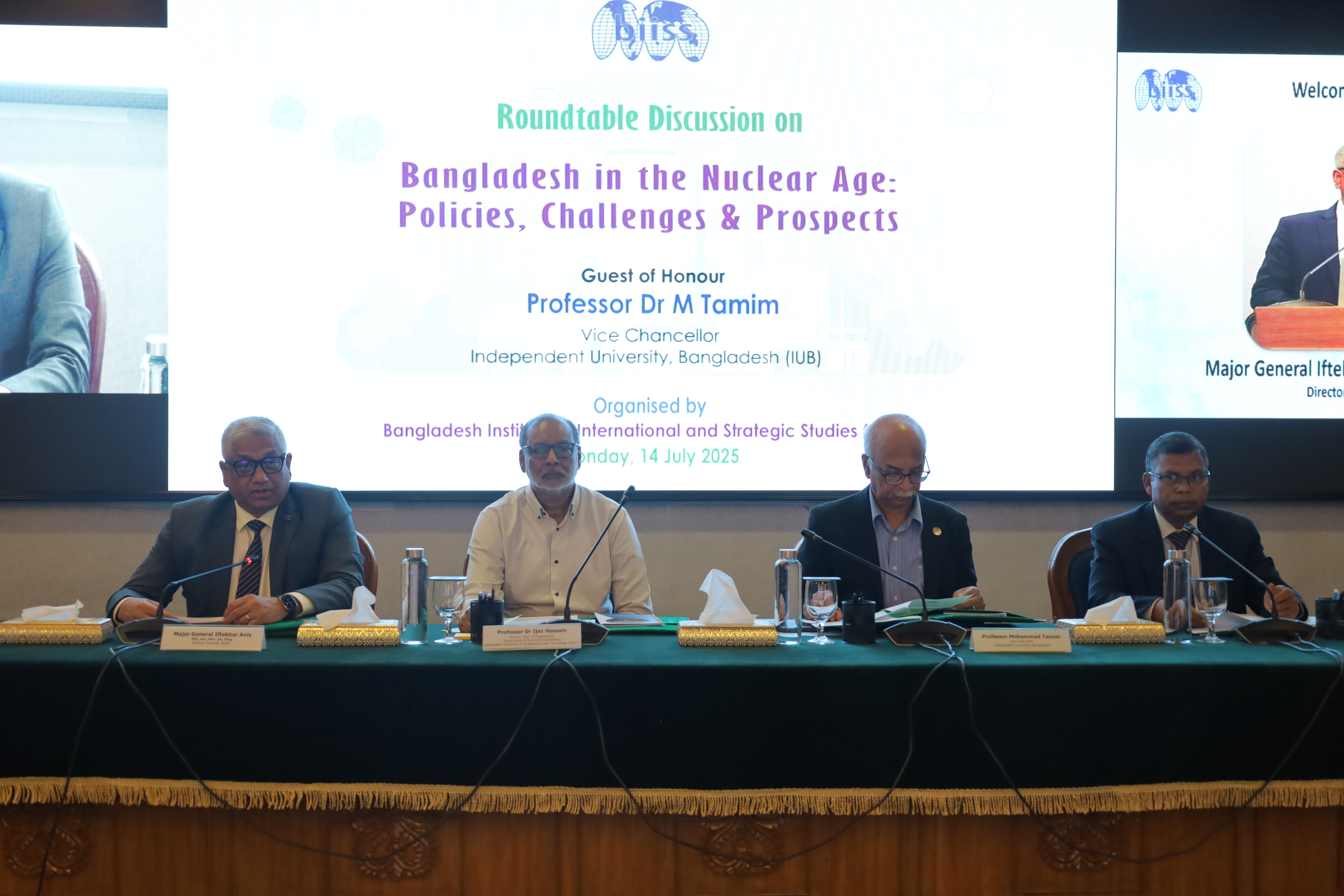Bangladesh Institute of International and Strategic Studies (BIISS) organised a Roundtable titled “Bangladesh in the Nuclear Age: Policies, Challenges and Prospects”, on Monday, 14 July 2025 at the BIISS auditorium. Professor Dr M Tamim, Vice Chancellor, Independent University, Bangladesh, graced the event as the Guest of Honour. Ambassador A F M Gousal Azam Sarkar, Chairman of BIISS, chaired the program while Professor Dr Ijaj Hossein, former Dean of Engineering, Bangladesh University of Engineering and Technology (BUET), moderated the discussion. The event began with a welcome address from the Director General of BIISS, Major General Iftekhar Anis, BSP, awc, afwc, psc, PEng.