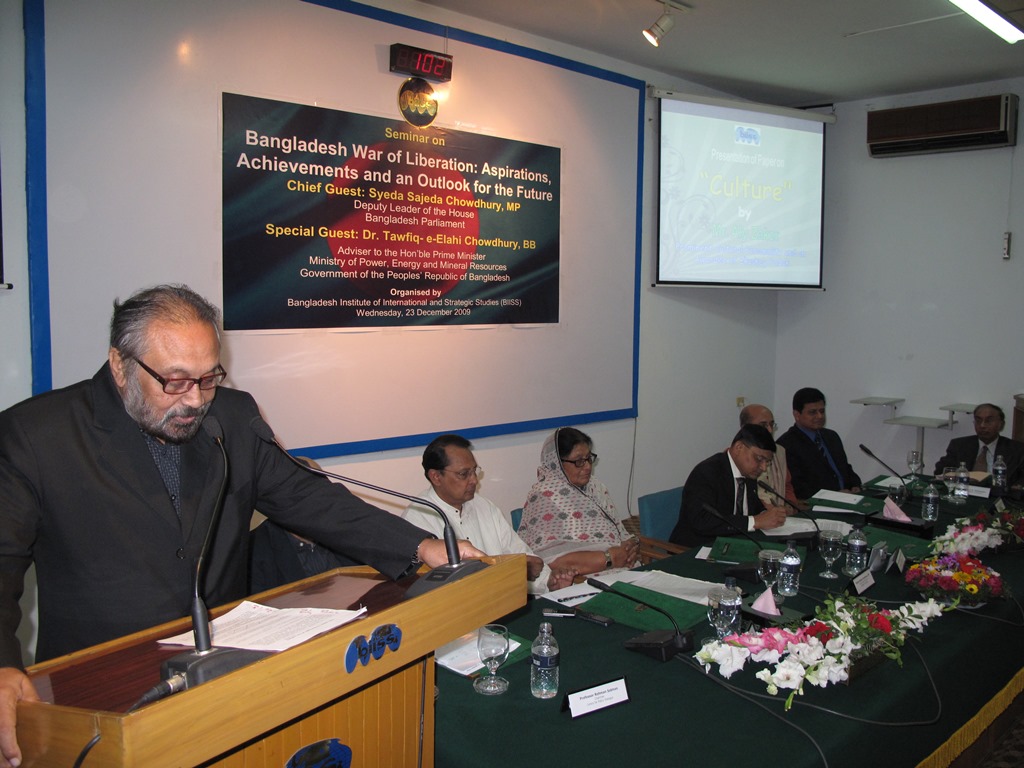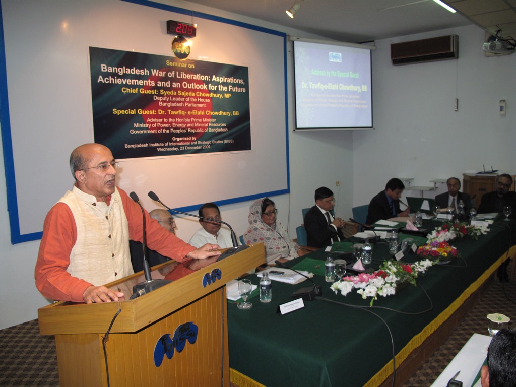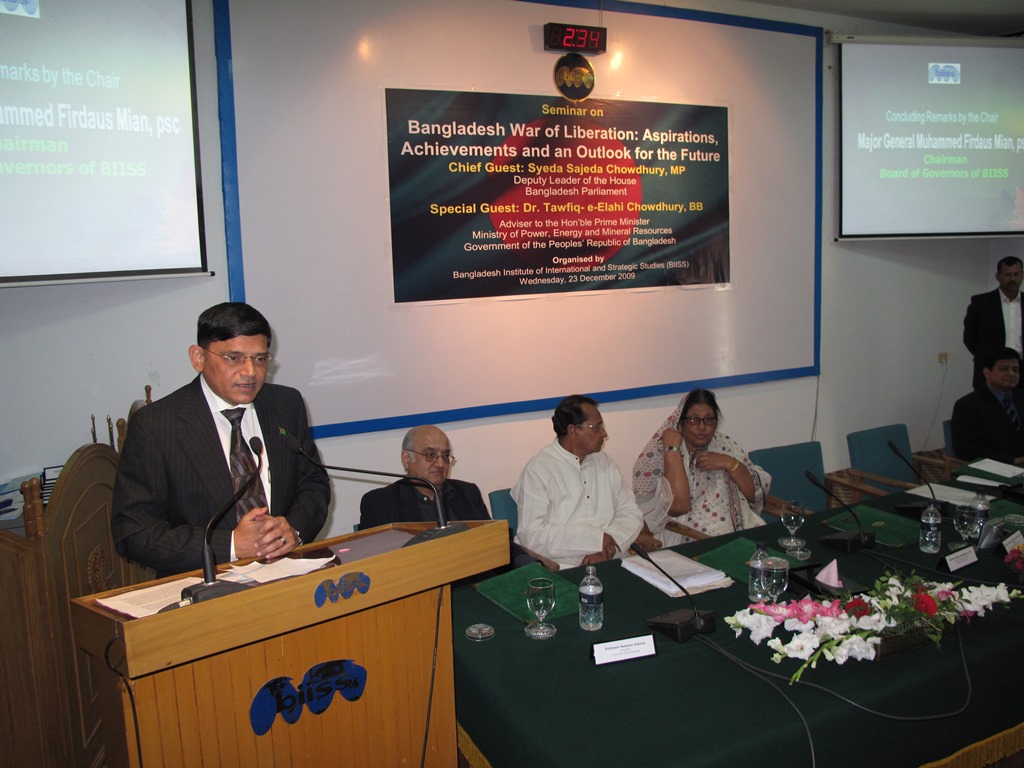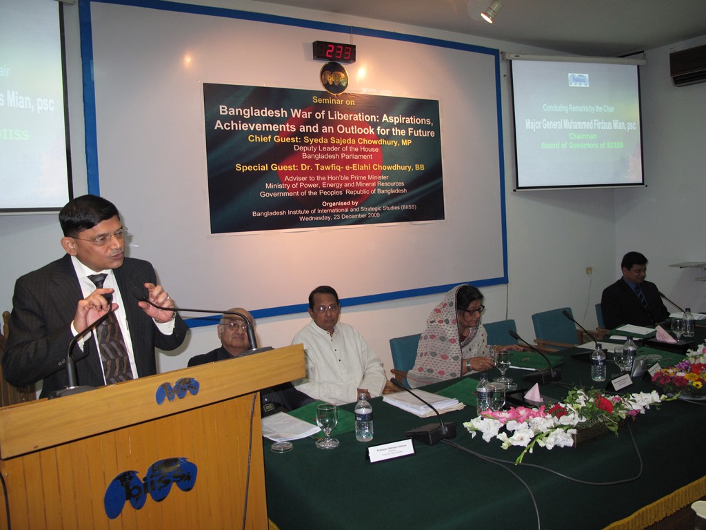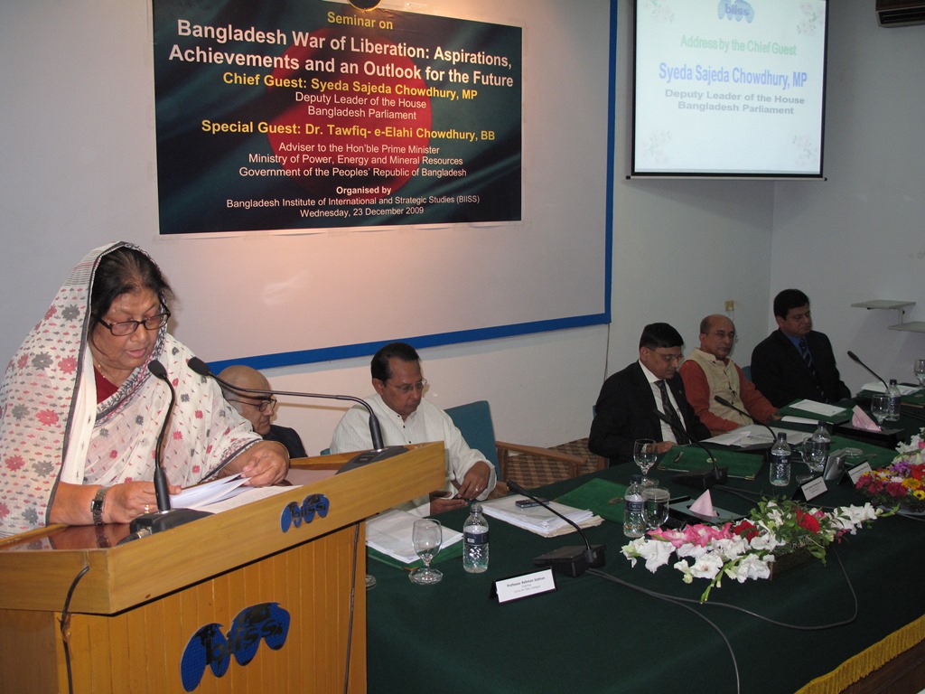BIISS organized a seminar on Bangladesh War of Liberation: Aspirations, Achievements and an Outlook for the Future on 23 December 2009 to commemorate the 38th Anniversary of the Victory Day of Bangladesh. The objective of the Seminar was to assess the achievements of Bangladesh in a host of crucial areas of national endeavours like democracy, development, national security, foreign policy and culture in the backdrop of aspirations of the War of Liberation in the respective fields followed by the projection of an outlook for the future. Syeda Sajeda Chowdhury, MP, Deputy Leader of the House, Bangladesh Parliament graced the seminar as the Chief Guest. Dr. Tawfiq-e-Elahi Chowdhury, BB, Adviser to the Hon'ble Prime Minister, Ministry of Power, Energy and Mineral Resources, Government of the People's Republic of Bangladesh was present as the Special Guest. Major General Sheikh Md Monirul Islam, ndc, psc, Director General, BIISS delivered the Welcome Address.