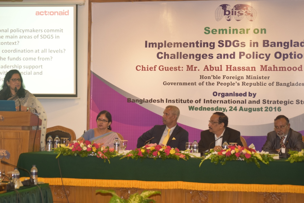 Bangladesh Institute of International and Strategic Studies (BIISS) organised a seminar on “Implementing SDGs in Bangladesh: Challenges and Policy Options” on 24 August 2016 at BIISS Auditorium. Mr Abul Hassan Mahmood Ali, MP, Honourable Foreign Minister, Government of the People’s Republic of Bangladesh was the Chief Guest at the Seminar. The seminar was divided into three sessions including two working sessions. Ambassador Munshi Faiz Ahmad, Chairman, Board of Governors, BIISS, chaired the inaugural and second working session. The first working session was moderated by Dr KAS Murshid, Director General, BIDS. Scholars, academicians, policy makers, former and current government officials were present in the seminar.