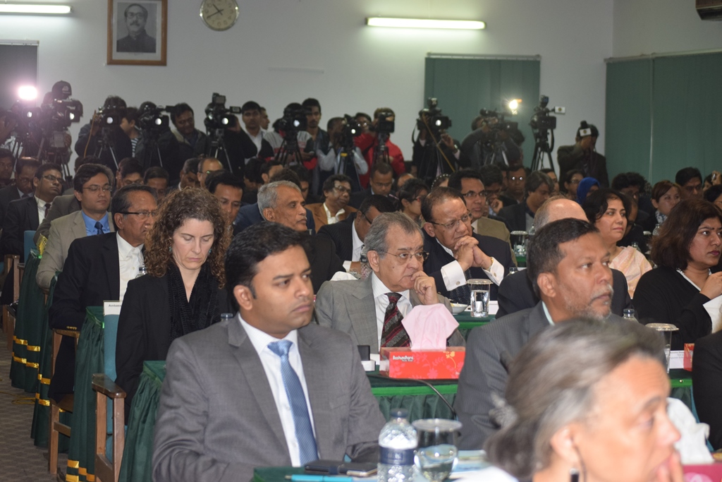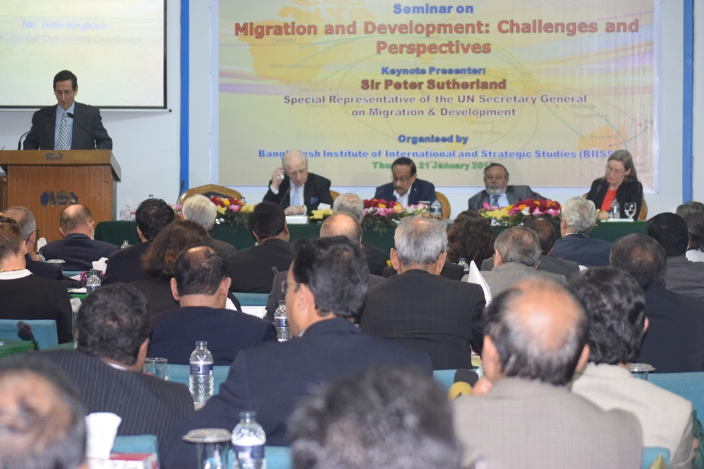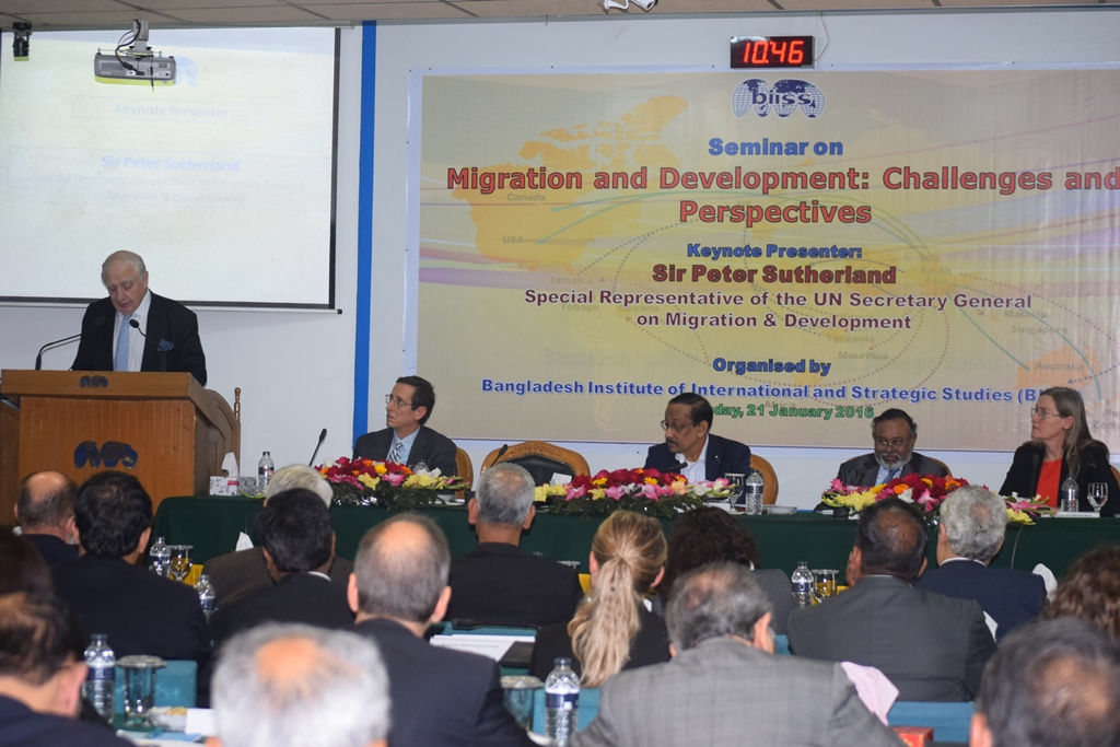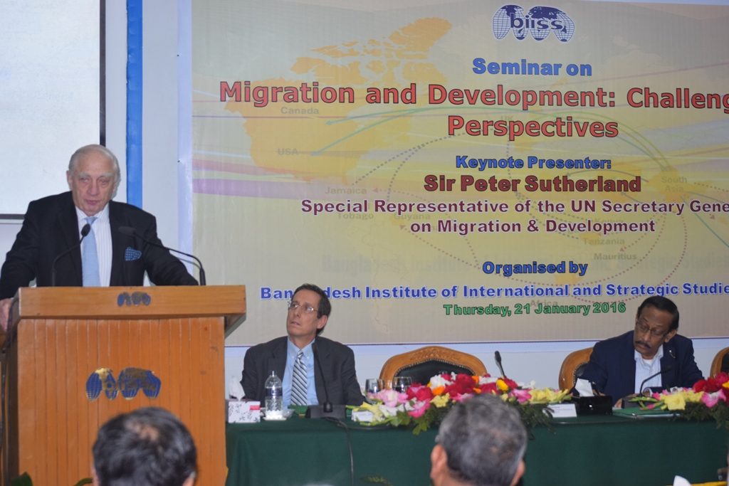 The seminar on “Migration and Development: Challenges and Perspectives” was organised jointly by Bangladesh Institute of International and Strategic Studies (BIISS) and Ministry of Foreign Affairs, Government of the People’s Republic of Bangladesh on Thursday, 21 January 2016 at BIISS Auditorium. Sir Peter Sutherland, Special Representative of the UN Secretary-General (SRSG) on Migration and Development made the keynote presentation. The designated discussants were Eva Akerman Borje, Seventh GFMD Chair, Sweden; and Mr John Bingham, ICMC, Global Civil Society Coordinator. Mr Md. Shahidul Haque, Foreign Secretary, Government of Bangladesh started the seminar with opening remarks and introduction of the speaker. Ambassador Munshi Faiz Ahmad, Chairman, Board of Governors of BIISS made the concluding remarks.
