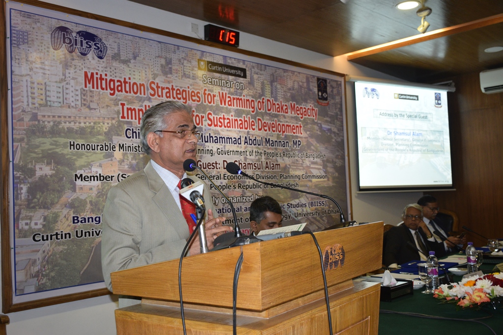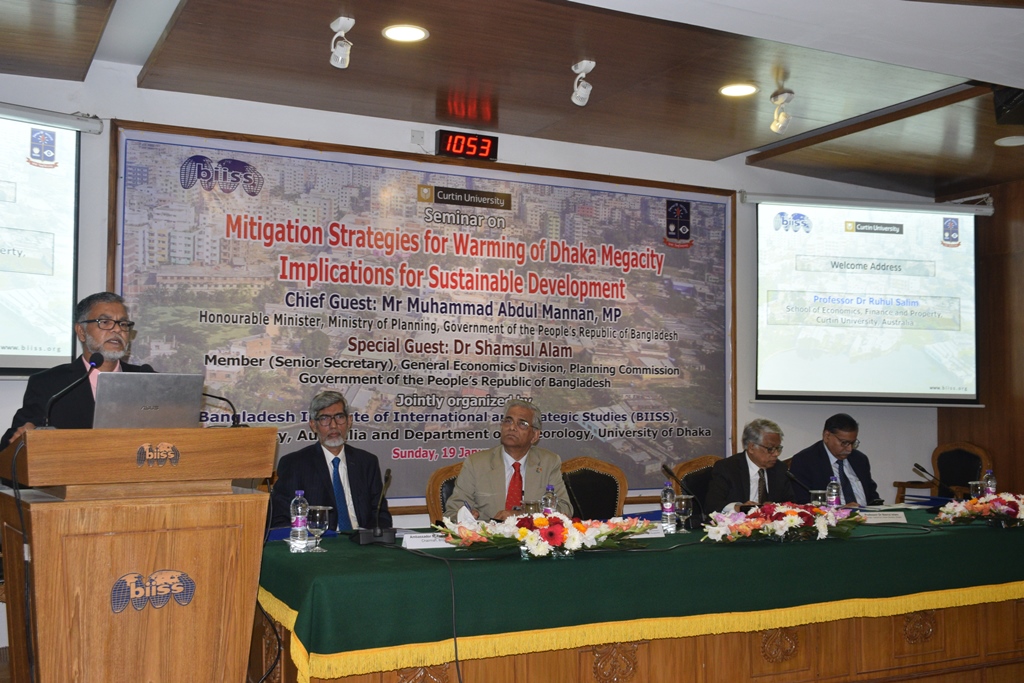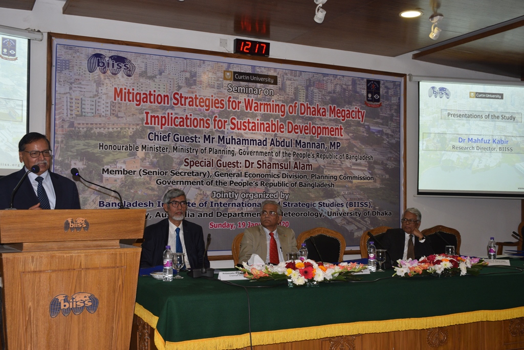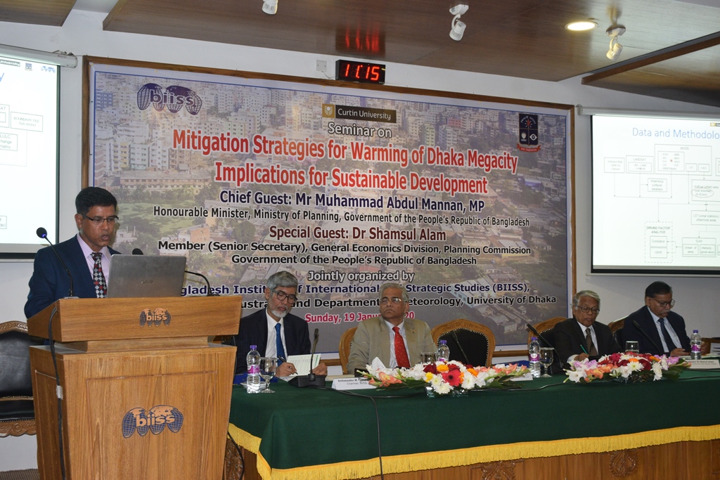 Bangladesh Institute of International and Strategic Studies (BIISS) in collaboration with Curtin University, Australia, and Department of Meteorology, University of Dhaka organized a seminar on “Mitigation Strategies for Warming Dhaka Megacity: Implication for Sustainable Development” on 19 January 2020 at BIISS Auditorium. The seminar is part of the research being jointly undertaken by the aforementioned institutes under the funding of the World Bank’s “Innovation Funding and Global Partnership for Sustainable Development Data” initiative. Dr Shamsul Alam, Member (Senior Secretary), General Economics Division, Planning Commission, Government of the People’s Republic of Bangladesh was present as special guest for the occasion. Professor Dr Nazrul Islam, Chairman, Centre for the Urban Studies, Dhaka chaired the seminar. Ambassador M. Fazlul Karim, Chairman, BIISS and Professor Dr Ruhul Salim, School of Economics, Finance and Property, Curtin University, Australia delivered the welcome address.