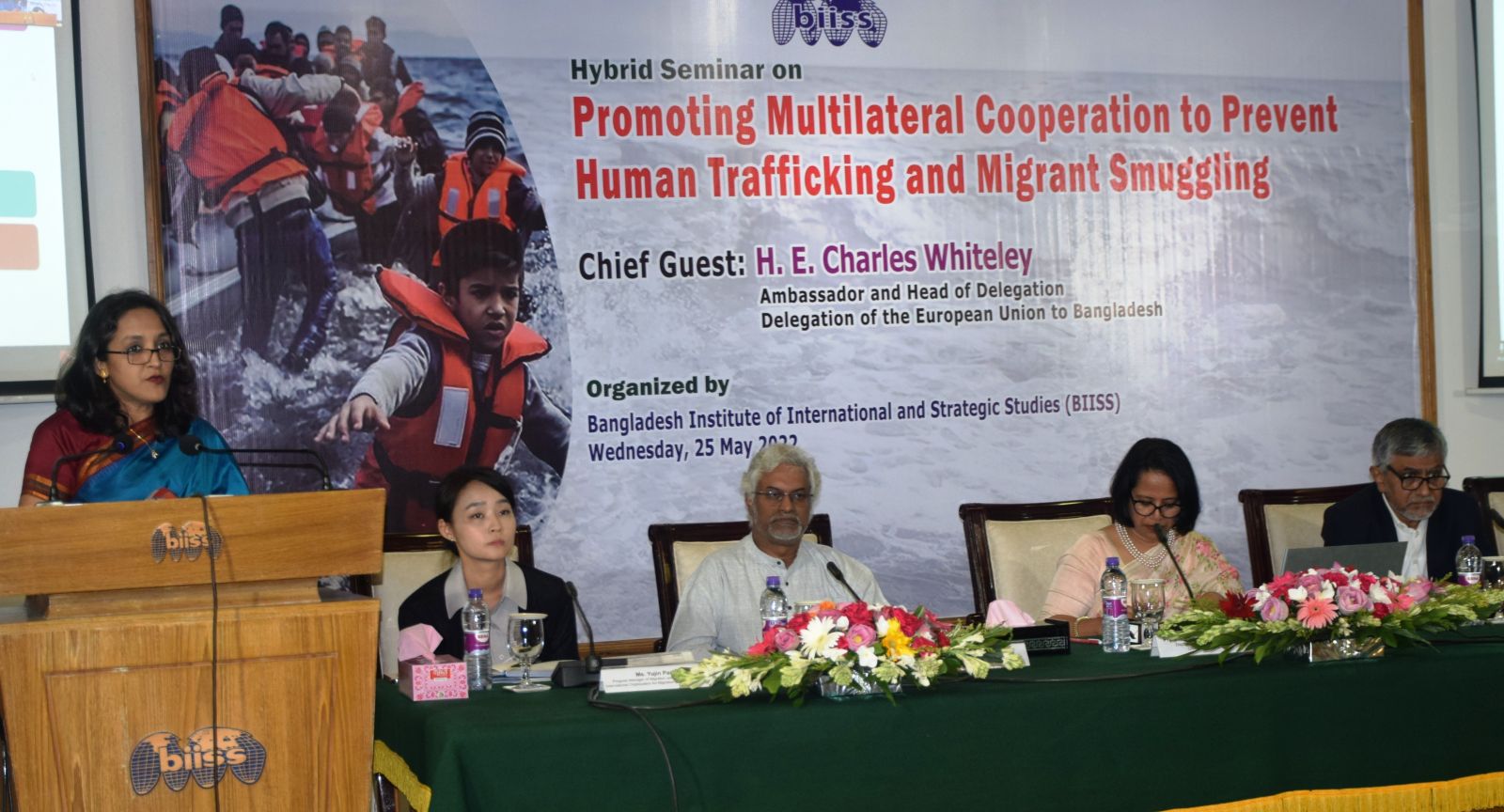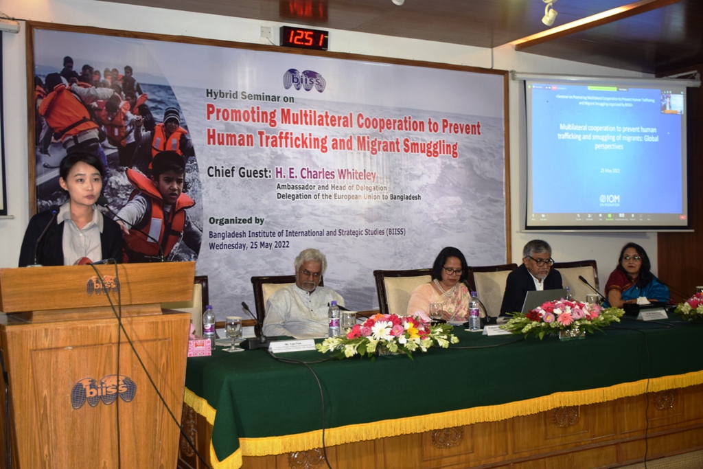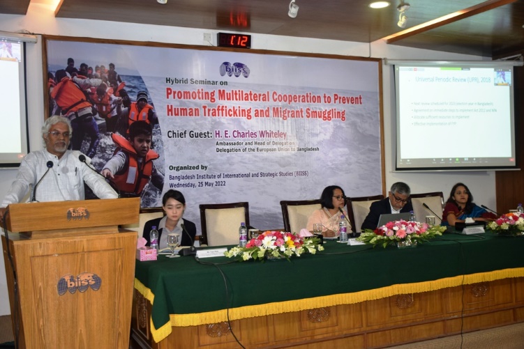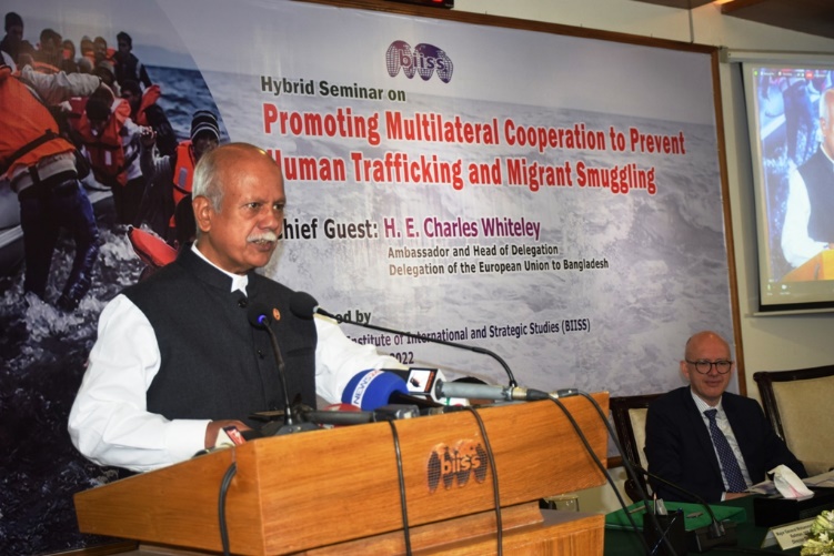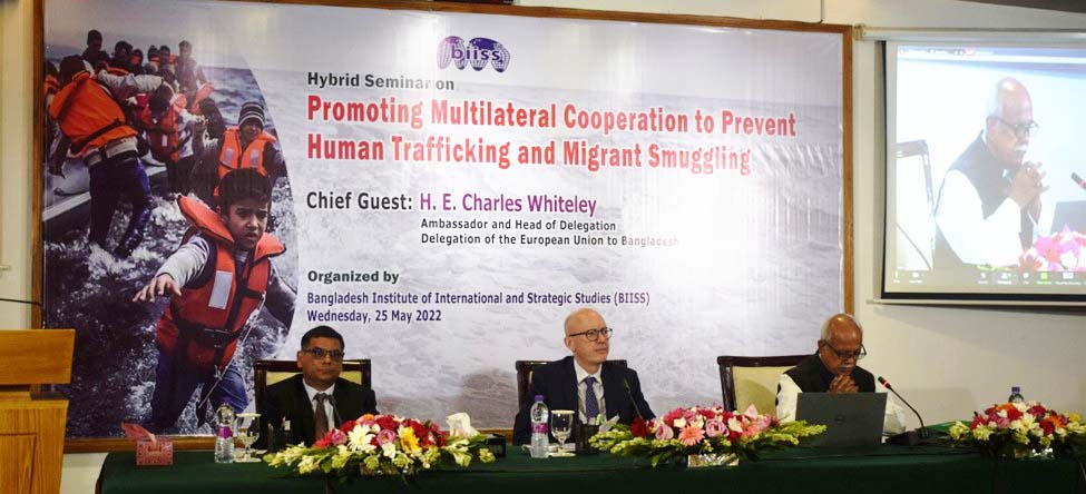Bangladesh Institute of International and Strategic Studies (BIISS) organized a Hybrid Seminar on “Promoting Multilateral Cooperation to Prevent Human Trafficking and Migrant Smuggling” on Wednesday, 25 May 2022 at the BIISS auditorium. Ambassador H.E. Charles Whiteley, Head of Delegation, Delegation of the European Union to Bangladesh, graced the occasion as the Chief Guest. Ambassador Kazi Imtiaz Hossain, PAA, Chairman, BIISS, chaired the inaugural session and Major General Mohammad Maksudur Rahman, OSP, BSP, psc Director General, BIISS, delivered the welcome address.