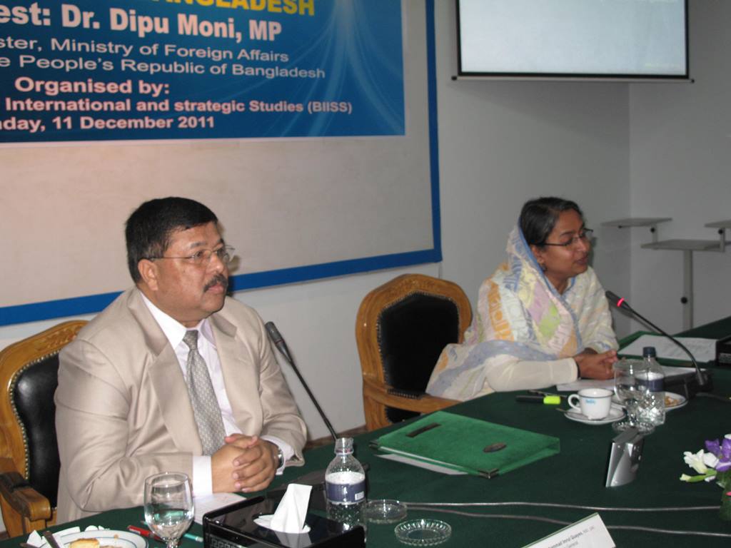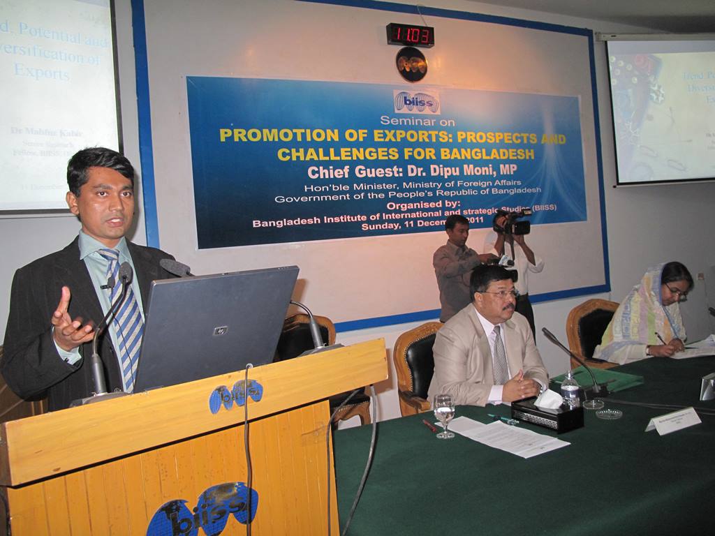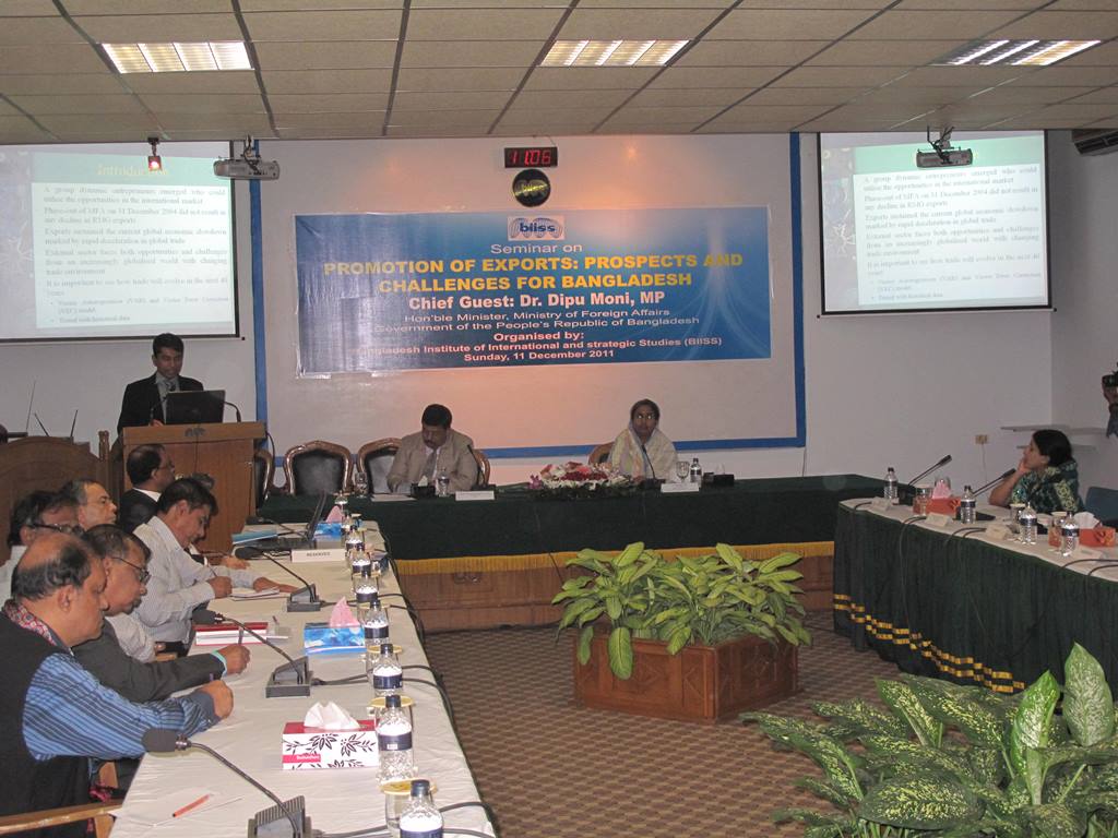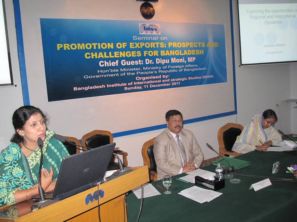 The Bangladesh Institute of International and Strategic Studies (BIISS) organized a Seminar on Promotion of Exports: Prospects and Challenges for Bangladesh in Dhaka on 11 December 2011. Dr. Dipu Moni, MP, Honourable Minister for Foreign Affairs, Government of the Peoples Republic of Bangladesh graced the occasion as the Chief Guest. The Director General of BIISS Major General Muhammad Imrul Quayes, ndc, psc chaired the session. Four presentations were made relating to the title of the Seminar. Dr. M Mahfuz Kabir, Senior Research Fellow of BIISS delivered a presentation on Trend, Potential and Diversification of Exports. The second presentation was delivered by Dr. Nazneen Ahmed, Senior Research Fellow of Bangladesh Institute of Development Studies (BIDS) on Exploring the Opportunities of Regional and International Dynamics. It was followed by a presentation on Looking Forward: Positioning Bangladesh in the Future World Market, made by Mr. Ahsan Khan Chowdhury, Deputy Managing Director, Pran Group. The fourth presentation was made by Mr. A.Z.M. Azizur Rahman, General Manager, BEPZA on Export Diversification and Role of Export Processing Zones in Bangladesh.