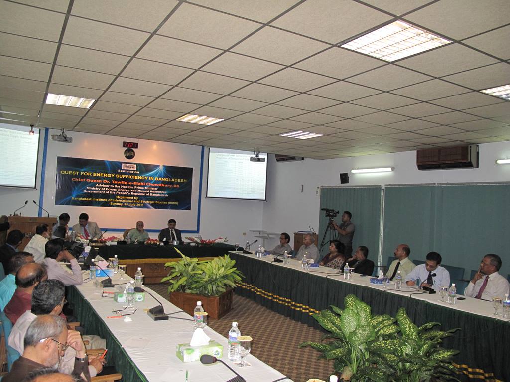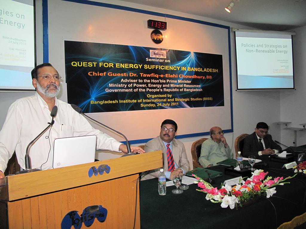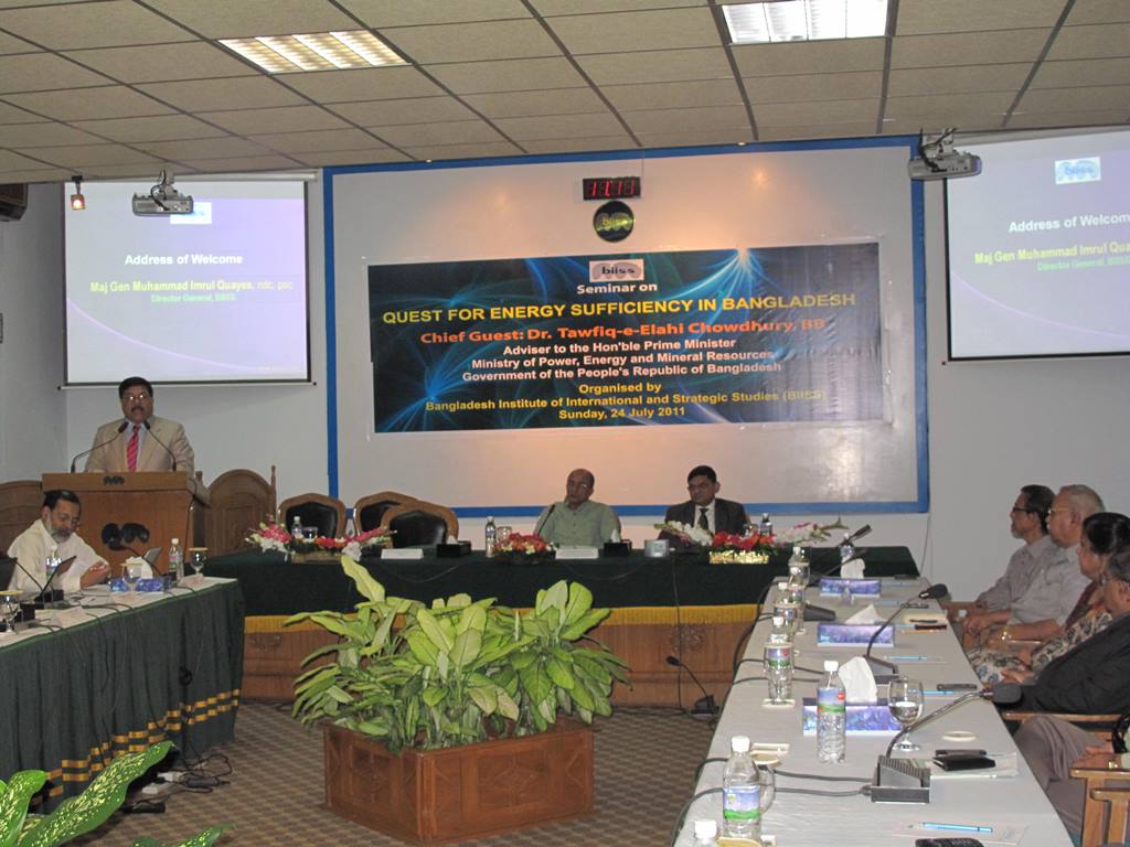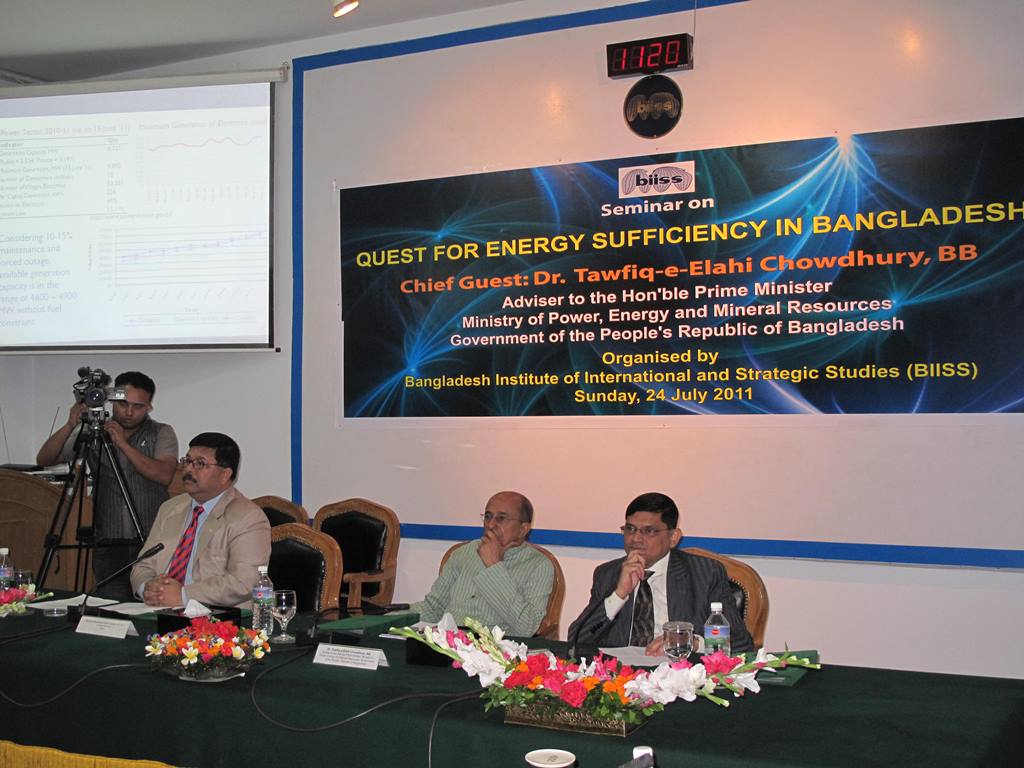 A Seminar on Quest for Energy Sufficiency in Bangladesh was organized by Bangladesh Institute of International and Strategic Studies (BIISS) on Sunday 24 July 2011 in the Institute's Auditorium. The Address of Welcome was given by Major General Mohammad Imrul Quayes, ndc, psc, Director General of BIISS. Dr. Tawfiq-e-Elahi Chowdhury, BB, Adviser to the Hon'ble Prime Minister, Ministry of Power, Energy and Mineral Resources, Government of the Peoples Republic of Bangladesh graced the occasion as Chief Guest. Dr. Mohd. Mahfuz Kabir, Senior Research Fellow, BIISS made a power point presentation on Energy Sector in Bangladesh: An Overview. Dr. Ijaz Hossain, Professor, Department of Chemical Engineering, BUET, Dhaka spoke on Policies and Strategies on Non-Renewable Energy. Dr. Shuddhasattwa Rafiq, Associate Professor, IBA Jahangirnagar University, Savar delivered on Energy Conservation and Investment on Renewable Energy.
