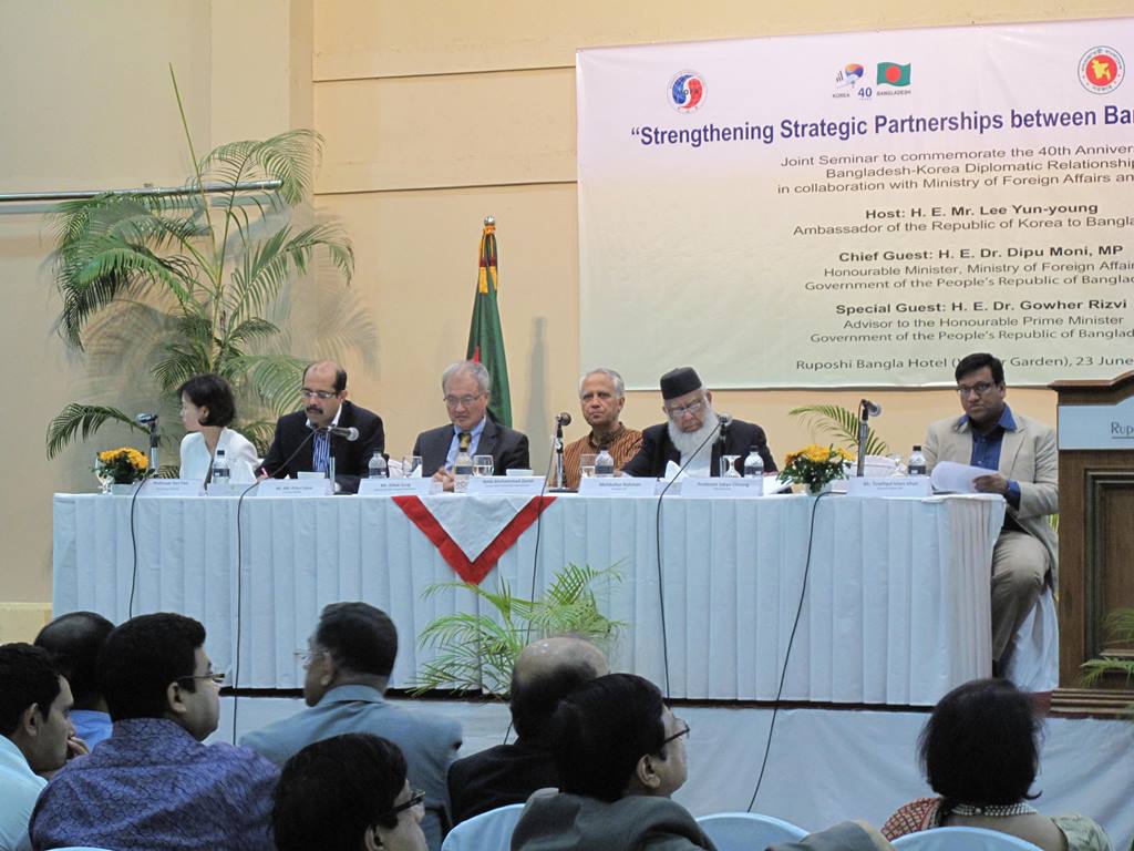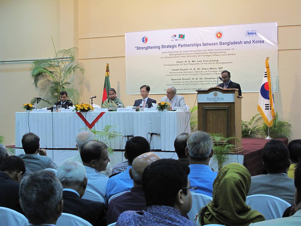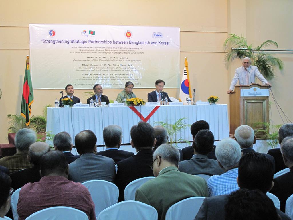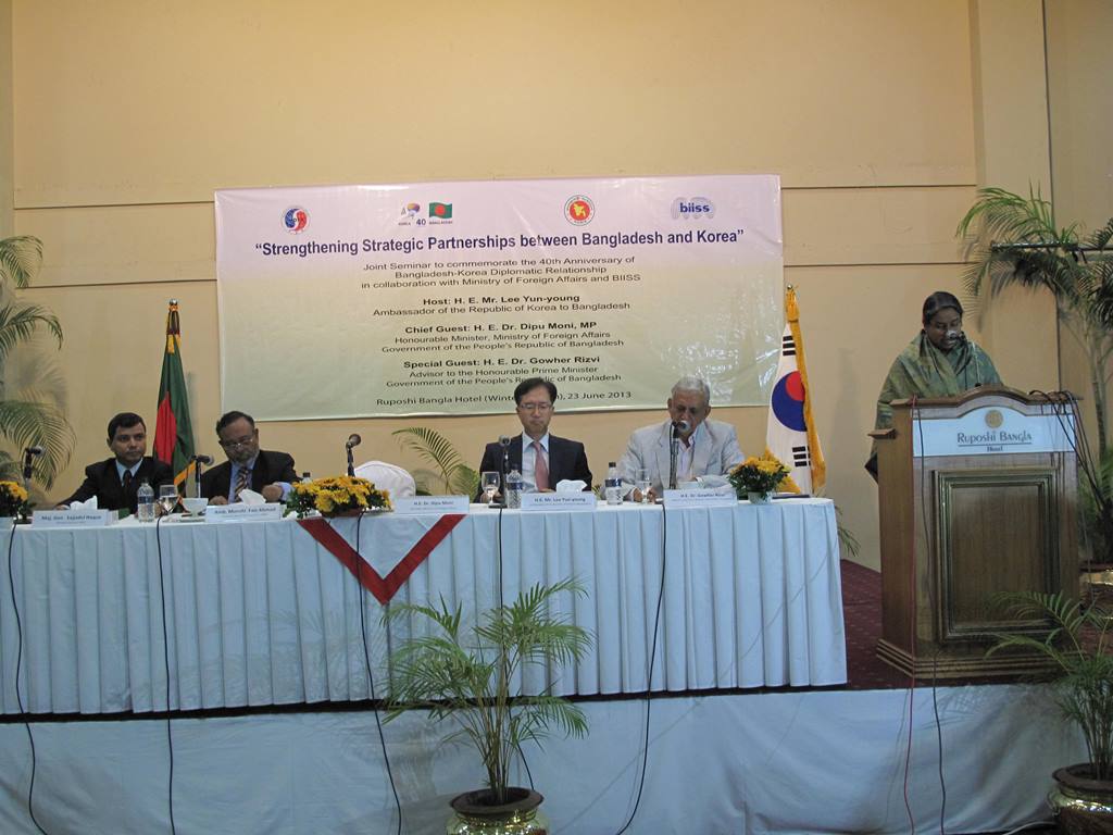 Korean Embassy, Ministry of Foreign Affairs and Bangladesh Institute of International and Strategic Studies (BIISS) jointly organised a Seminar on Strengthening Strategic Partnerships between Bangladesh and Korea on Sunday, 23rd June 2013, at Ruposhi Bangla Hotel, Dhaka. Dr. Dipu Moni MP, Minister, Ministry of Foreign Affairs was present at the Seminar as the Chief Guest. Ambassador Munshi Faiz Ahmad, Chairman, Board of Governors, BIISS, chaired the inaugural session of the Seminar. Major General Sajjadul Haque, afwc, psc, Director General of BIISS, delivered the Address of Welcome and H.E. Lee Yun Young ambassador of the Republic of Korea to Bangladesh, delivered the opening remarks in the inaugural session of the seminar. H. E. Dr. Gowher Rizvi, Advisor to the Prime Minister, Government of the People's Republic of Bangladesh, was present as the Special Guest. Foreign Secretary Md. Shahidul Haque delivered the closing remarks to the daylong seminar.
