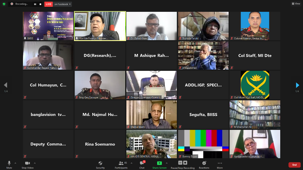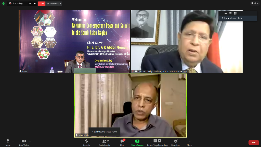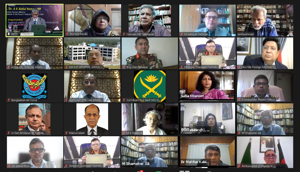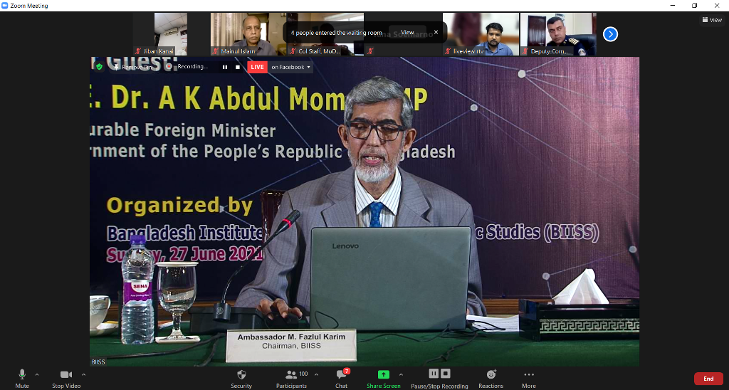 Bangladesh Institute of International and Strategic Studies (BIISS) organized a webinar on “Revisiting Contemporary Peace and Security Challenges in the South Asian Region” on 27 June 2021. H. E. Dr A K Abdul Momen, MP, Honourable Foreign Minister, Government of the People’s Republic of Bangladesh graced the occasion as the Chief Guest. Ambassador M Fazlul Karim, Chairman, BIISS chaired the webinar while Major General Md Emdad Ul Bari, ndc, psc, te, Director General, BIISS delivered the welcome address. Five distinguished scholars made presentations on various crucial security challenges in the South Asian region.